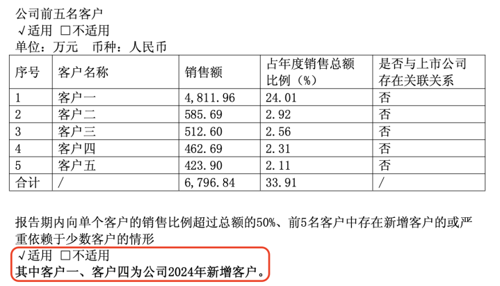 更正后,公司适用上述情形,并表示,“其中客户一、客户四为公司2024年新增客户。”