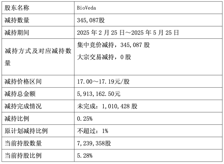 另外,奥精医疗5月26日公告,公司于近日收到大股东BioVeda China RMB Investment Limited出具的《关于减持奥精医疗股票的结果告知函》,截至5月25日,BioVeda China RMB Investment Limited累计已减持公司股份34.51万股,占公司总股本比例为0.25%,截至公告披露日,本次减持计划已减持时间区间届满。